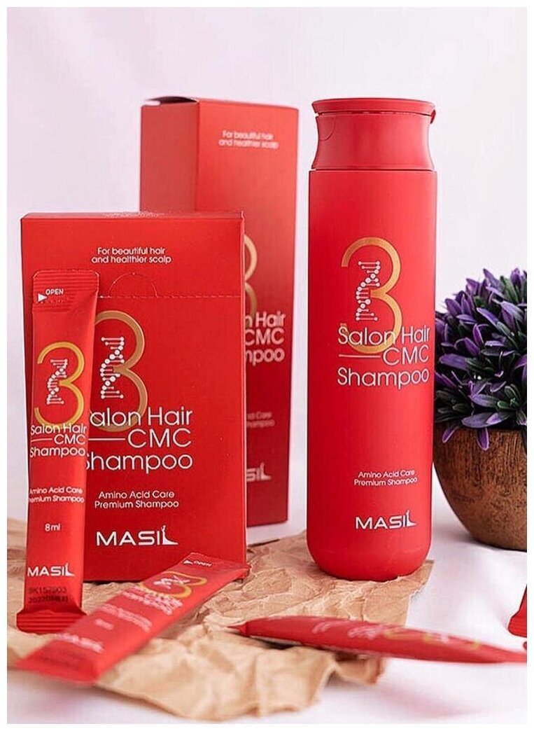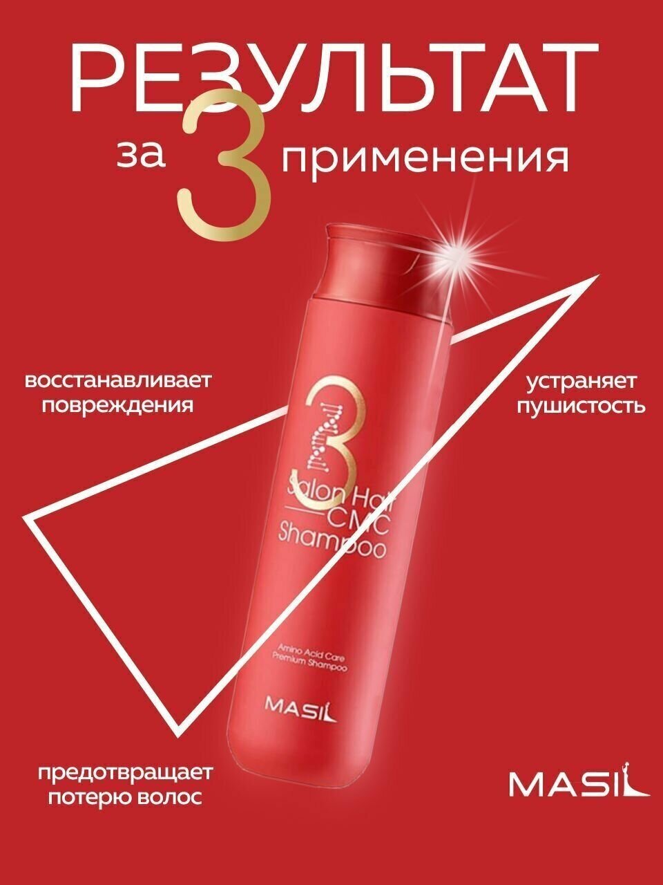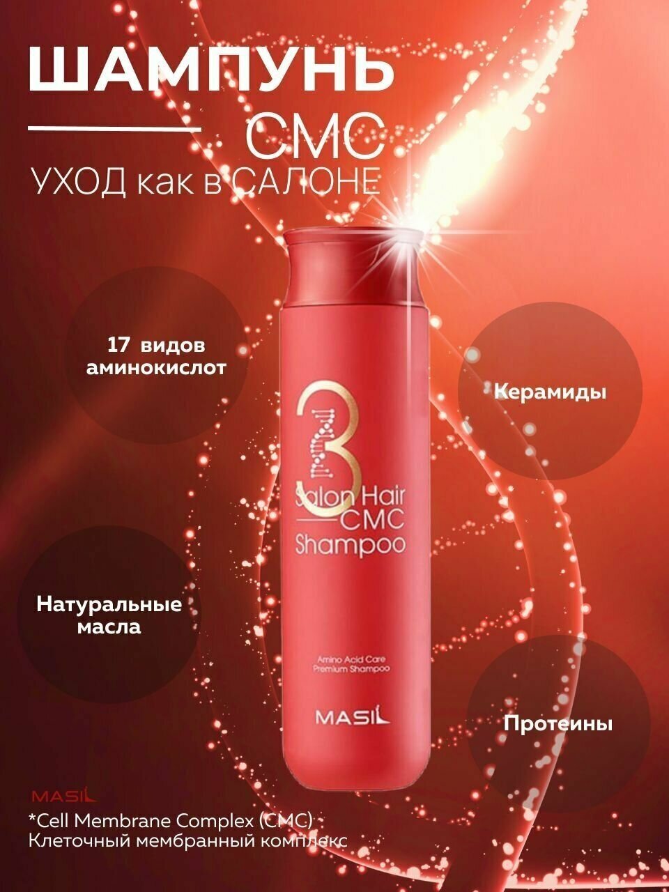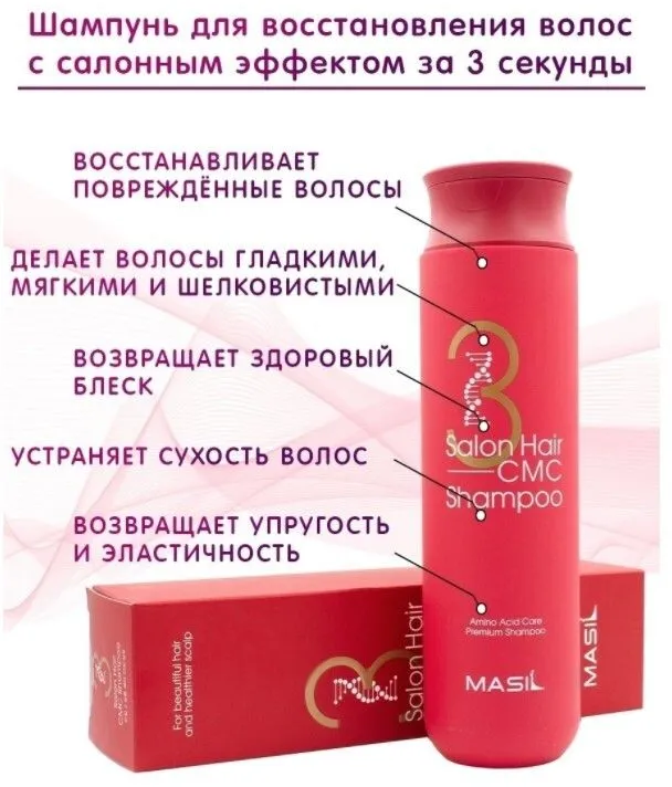 Восстанавливающий шампунь с аминокислотами Masil 3 Salon Hair CMC Shampoo глубоко увлажняет волосы, не утяжеляя их, придает блеск, здоровый вид и способствует улучшению роста волос. Шампунь питает волосы, устраняет выпадение, обеспечивает гладкость и шелковистость.