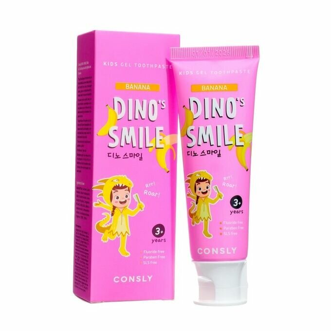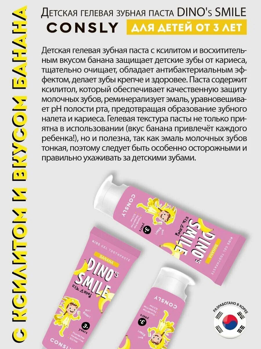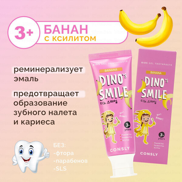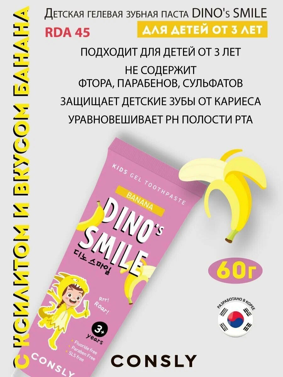 Детская гелевая зубная паста Consly Dino's Smile с банановым вкусом предназначена для детей от 3 до 5 лет. Вес пасты составляет 60 грамм, что делает ее удобной для использования и экономичной.